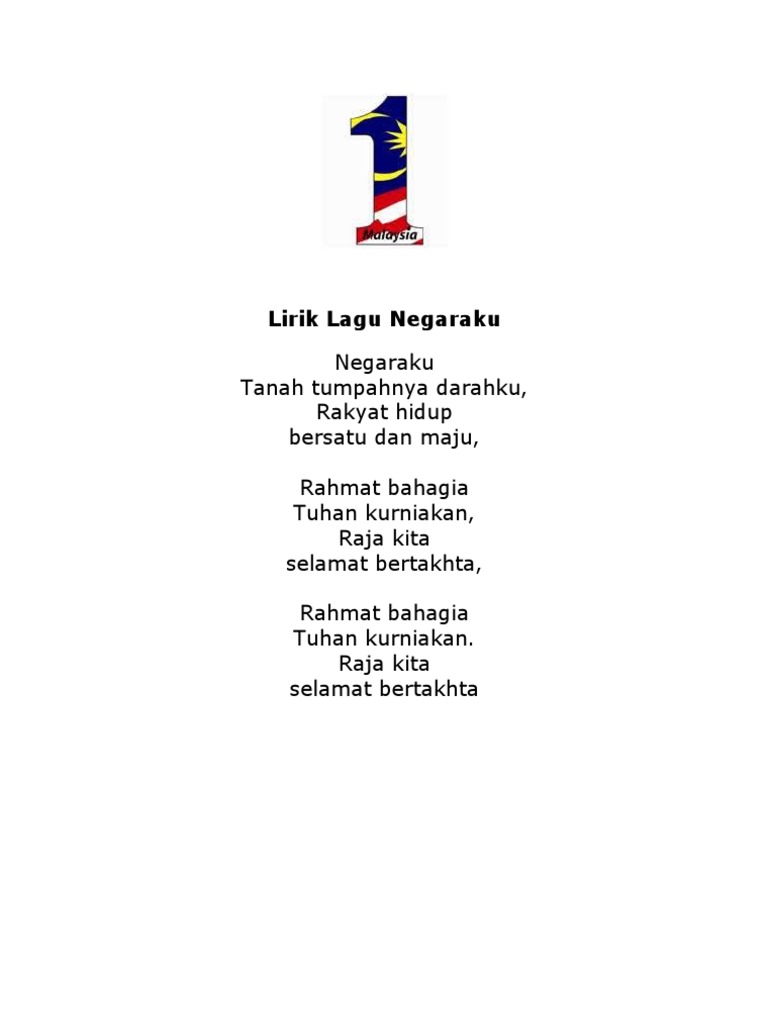 Walau diterjah ku tak ambil peduli Di medan perang aku terus berani Kibarkan bendera naikkan semangatku. Lirik lagu negaraku - lagu kebangsaan malaysia negaraku tanah tumpahnya darahku rakyat hidup bersatu dan maju rahmat bahagia tuhan kurniakan raja kita selamat bertakhta rahmat bahagia tuhan kurniakan. Lirik Lagu Satu Malaysia.